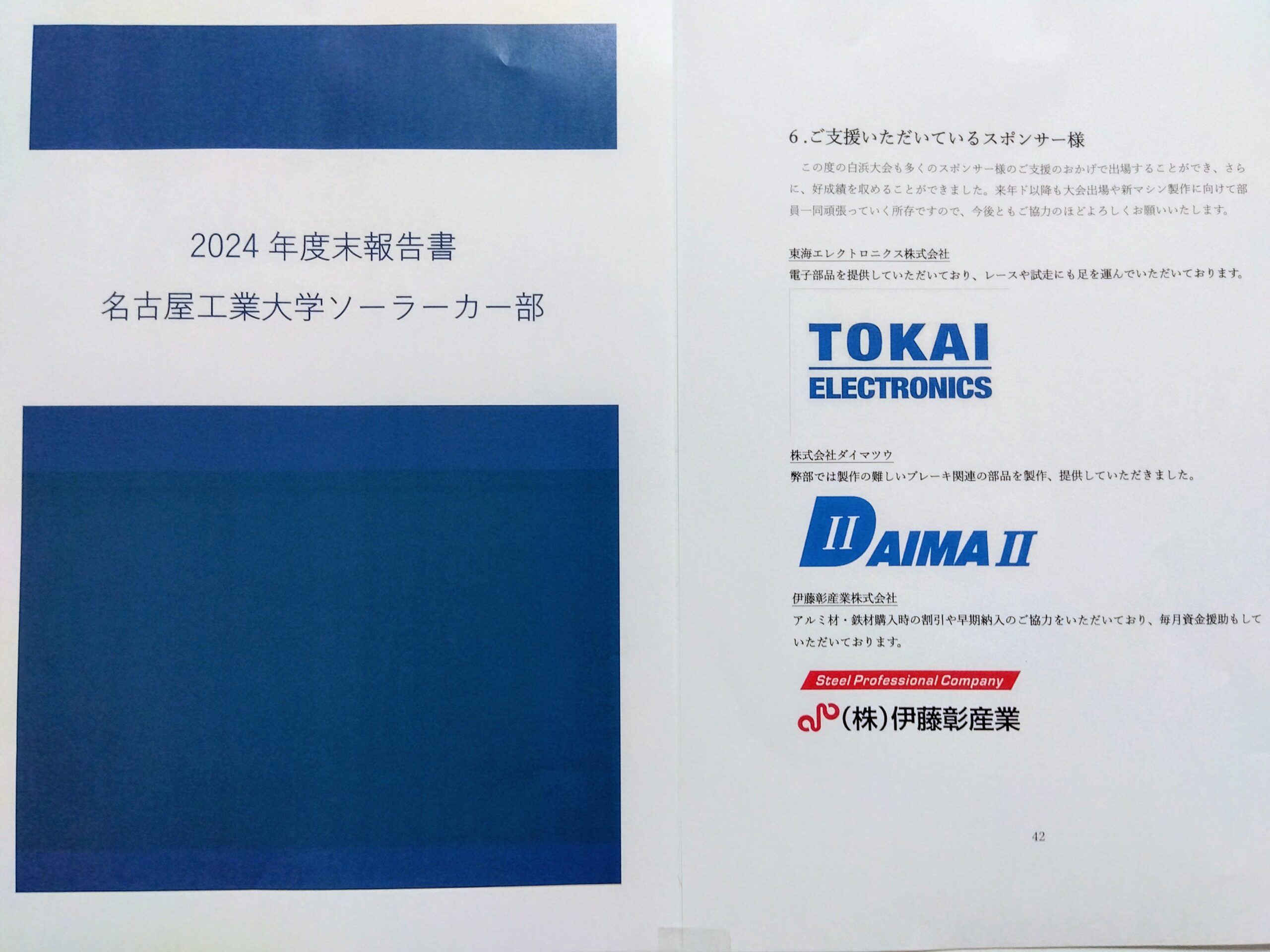 当社がスポンサー企業を務めている名古屋工業大学ソーラーカー部より、 2024年度末報告書をいただきました!